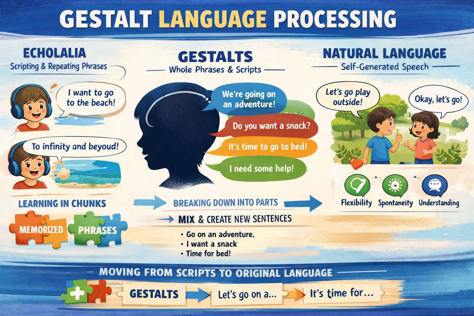 Language development happens in different ways for different people. While many children learn speech word by word, others learn language in larger chunks or scripts.